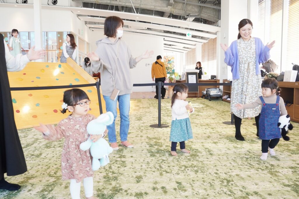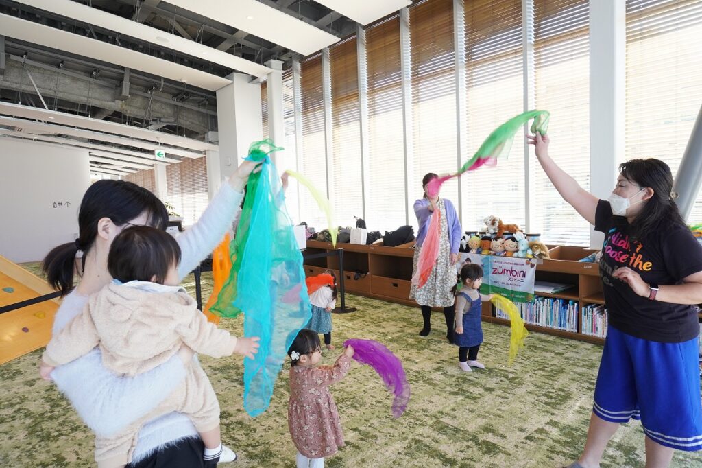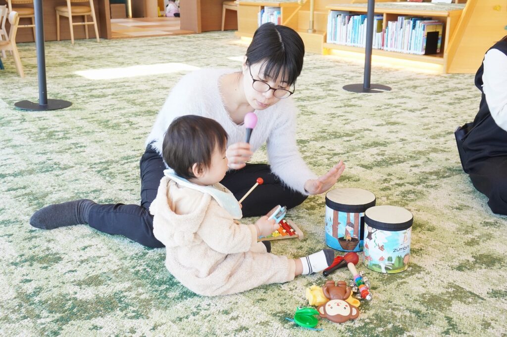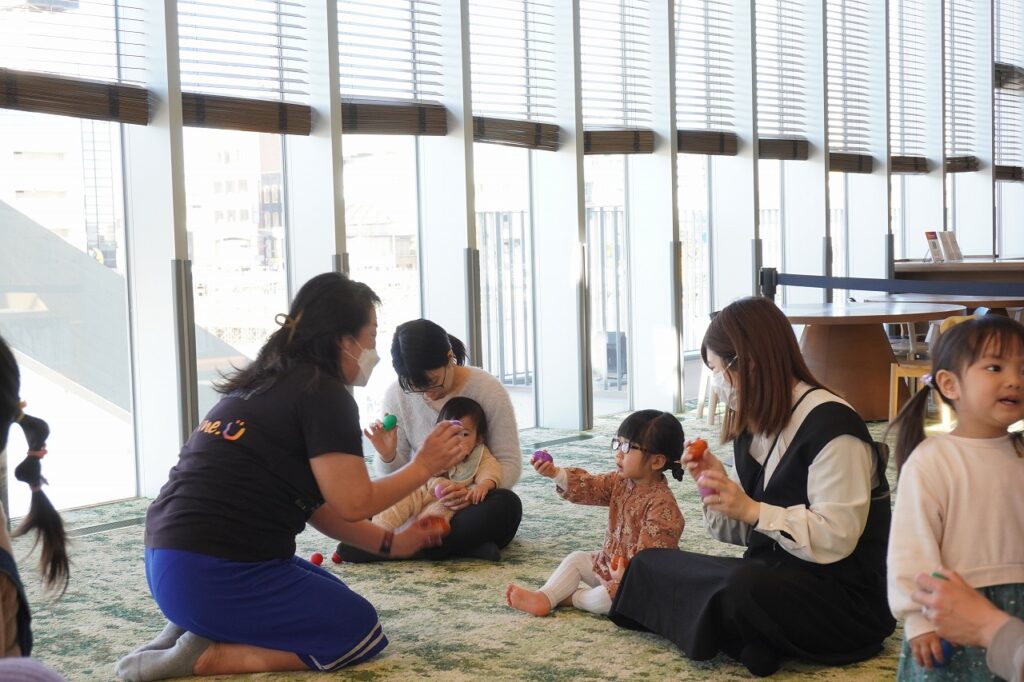 音楽に合わせて踊ったり、英語にふれて遊んだり、楽器を使ってリズムを感じたり。